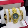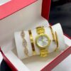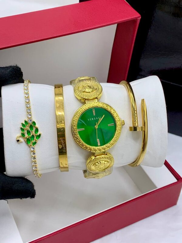 The watch is beautifully complemented by three unique bangles, creating a layered wrist stack that is instantly chic. You get a delicate tennis bracelet featuring striking green marquise-cut stones, a sleek engraved bangle that reads “Forever Love,” and a trendy nail-style cuff.