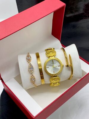 Ignite your style with this exquisite Quality Female Versace Watch and Bracelet Set. A true celebration of luxury, this set features a captivating emerald green dial watch framed by the iconic Medusa head and bold gold-tone hardware. This is more than jewelry; it’s a signature look that exudes confidence and sophistication.