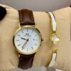 Each watch features the iconic ultra-thin Daniel Wellington case and a clean, eggshell white dial with striking gold-toned indices and hands. This classic, minimalist design ensures the set is versatile enough for both formal events and everyday wear. The inclusion of subtle gold-toned bracelets—a delicate four-leaf clover enamel bangle and a woven cuff—allows for effortless styling and layering, enhancing the overall luxurious look.