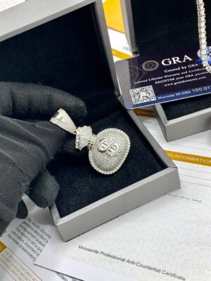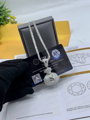 Elevate your style game with an undeniable statement piece designed for those who appreciate the finer things. Introducing our show-stopping Moissanite Tennis Chain and Dollar Bag Pendant – the ultimate symbol of success, ambition, and impeccable taste. This isn’t just jewelry; it’s a testament to your grind, crafted to catch every eye and sparkle with unparalleled brilliance.