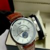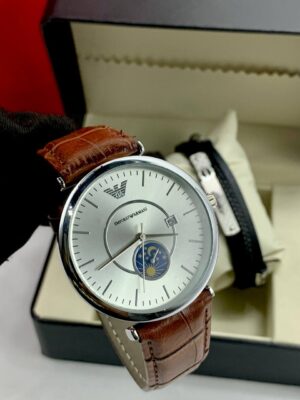 The included watch, styled after the luxurious Emporio Armani aesthetic, features a captivating silver-tone dial with a sophisticated design. The genuine leather strap ensures comfort and durability, while the meticulous craftsmanship guarantees a reliable timepiece you can trust. A unique blue-accented sub-dial adds a touch of distinctive charm, capturing the light and drawing the eye. This watch functions as more than a timekeeper—it’s a subtle yet powerful signal of your success.