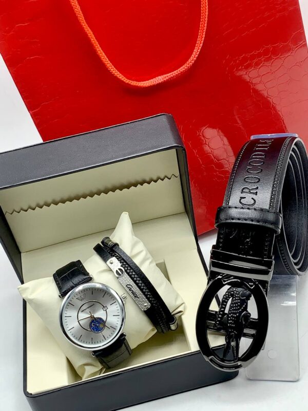 Complementing the watch is a designer belt that exudes confidence. Crafted from quality material and embossed with the bold “CROCODILE” text, it features a heavy-duty buckle shaped like a crocodile. This iconic centerpiece is a conversation starter, instantly adding a rugged, high-fashion edge to any formal or semi-casual ensemble. The rich black color ensures maximum versatility.
